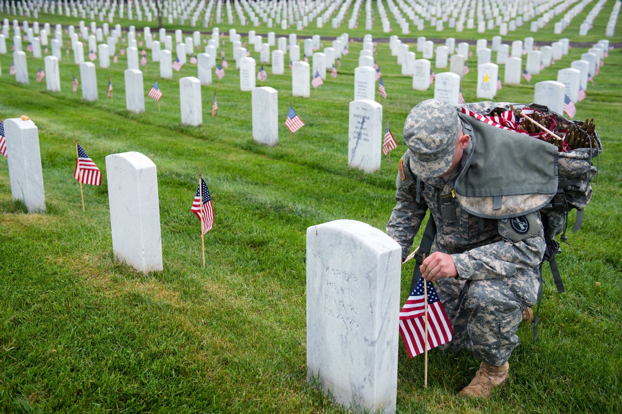 “Flags In” Pvt. Brian Engelhard, 3d U.S. Infantry Regiment (The Old Guard), Hotel Company, places American flags at headstones in Section 64 of Arlington National Cemetery during “Flags in,” May 21, 2015, in Arlington, Va. The Old Guard has conducted “Flags-in,” when an American flag is placed at every headstone, since 1948. (U.S. Army photo by Rachel Larue/released)